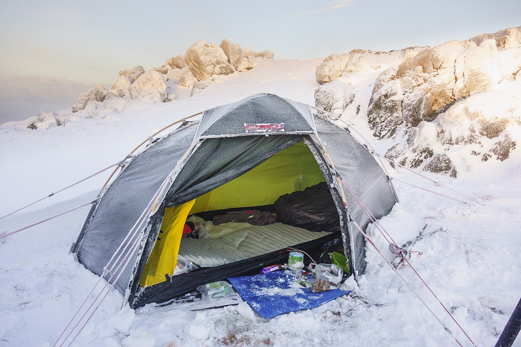 Later that evening the wind began to pick up and the snow returned signalling the next frontal system making its way in, reluctantly I closed the outer door and enjoyed the rest of the evening relaxing listening to sound of winds and snow on the flysheet, enjoying a meal and a few more whisky's before I called it a night.